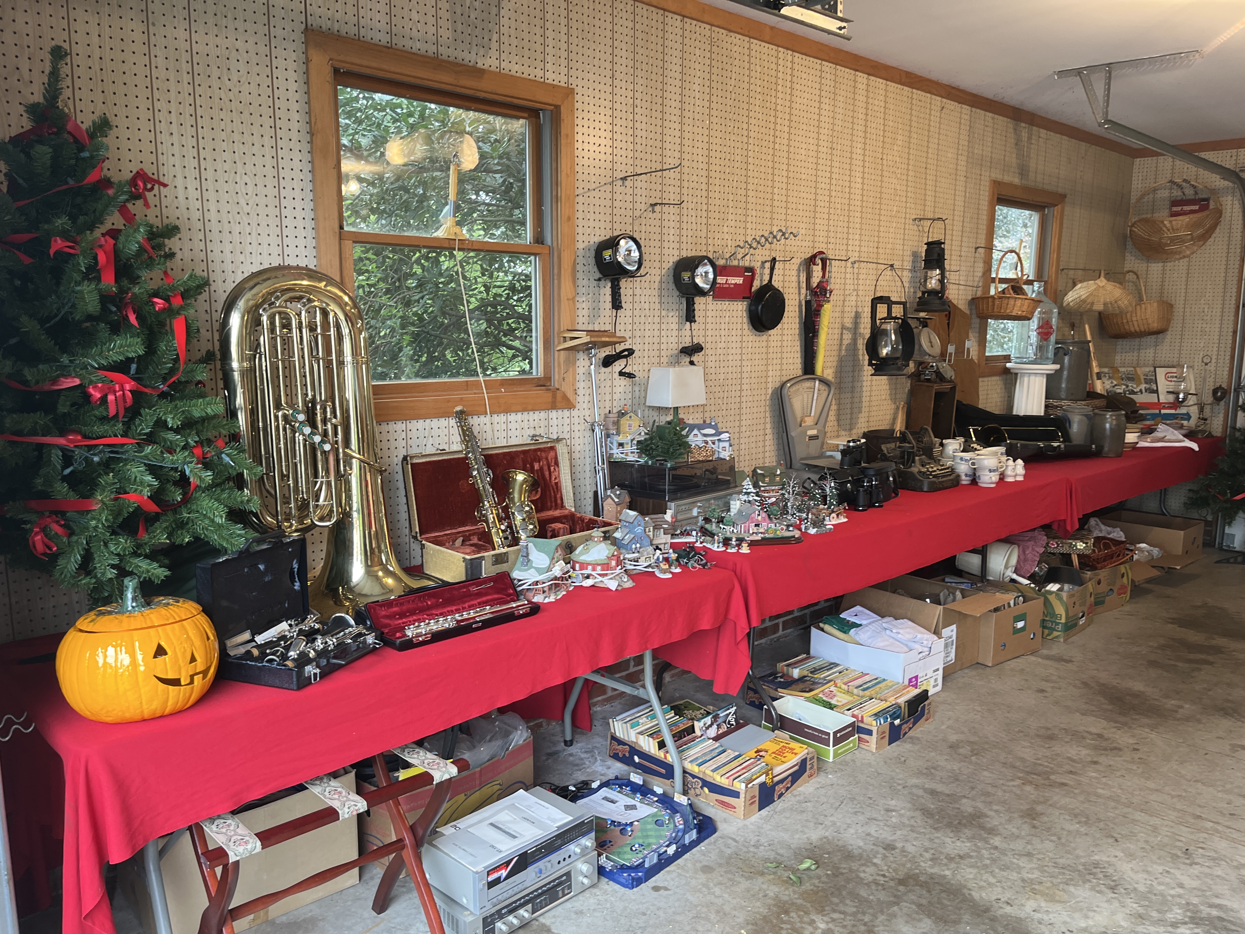 Several blue slip decorated crocks, Mocha Ware chamber pot, nice selection of instruments including a Conn tuba, trombone, saxophone, flute, clarinet and a ukelele, vintage stereo equipment, early typewriters and adding machines including Oliver, country store style scales, walking canes, jewelry, advertising items including Remington ammo box, decorative textiles, several early butter churns, Yellowware bowl, ironstone pitcher and bowl, books, depression glass, Christmas items, several mantle clocks, board games, wooden runner sled, antique parlor lamp.