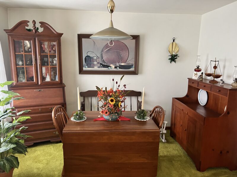 Nice selection of cherry furniture including a large secretary desk, drop leaf table, dry sink, bedroom suite, and early soft wood dovetailed blanket chest**, mahogany slant top desk, 5 drawer chest of drawers, 8 piece paint decorated plank bottom chair set *, several cedar chests, decorated plank bottom rockers* & more!