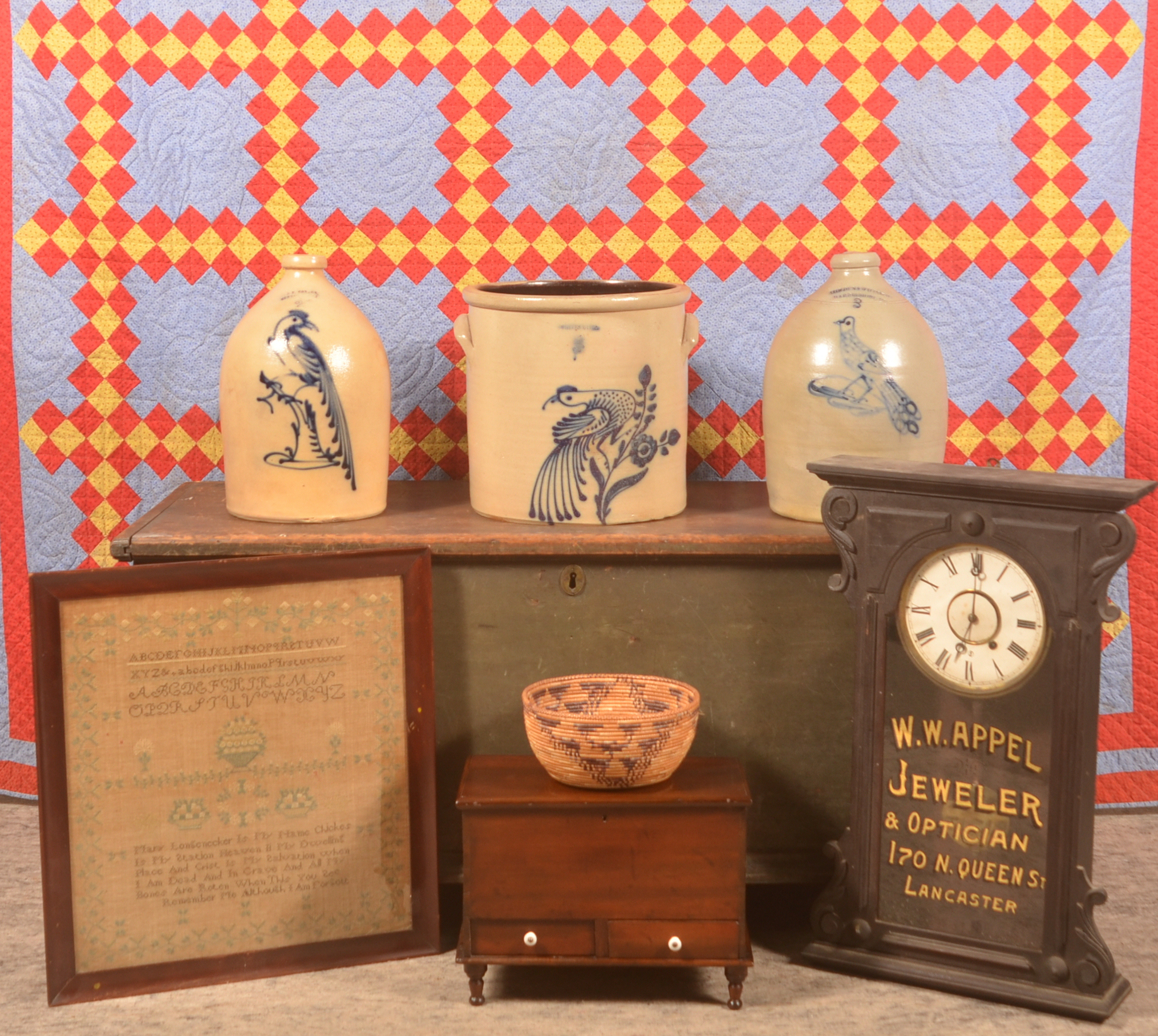 This diverse auction will include a selection of Pennsylvania Stoneware to include a 20-Gal. James Hamilton jar, vertical stripe tobacco crock, Cowden & Wilcox jug with blue flowers and a 3-Gal. freehand-decorated Uniontown crock, Christmas Kugels, Painted Furniture, Primitives, Dateboards, Cast Iron Mechanical Toys, Mohair Animals, Artwork to include a signed 19th C. New England miniature watercolor portrait, PA samplers from Manheim, Ephrata, Chickies/Marietta, Lancaster and Germantown, Quilts and Textiles, Sterling Silver, Early Tools including signed Goosewing Axes, Advertising, Early Documents including an 1809 Deed between Jacob Eichholtz and his parents.